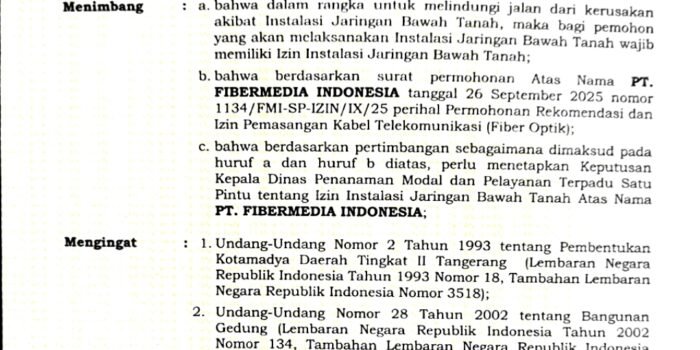 Kota Tangerang – Pemerintah Kota Tangerang menegaskan proyek galian kabel fiber optik milik PT Fibermedia Indonesia (FMI) telah mengantongi izin resmi, bukan